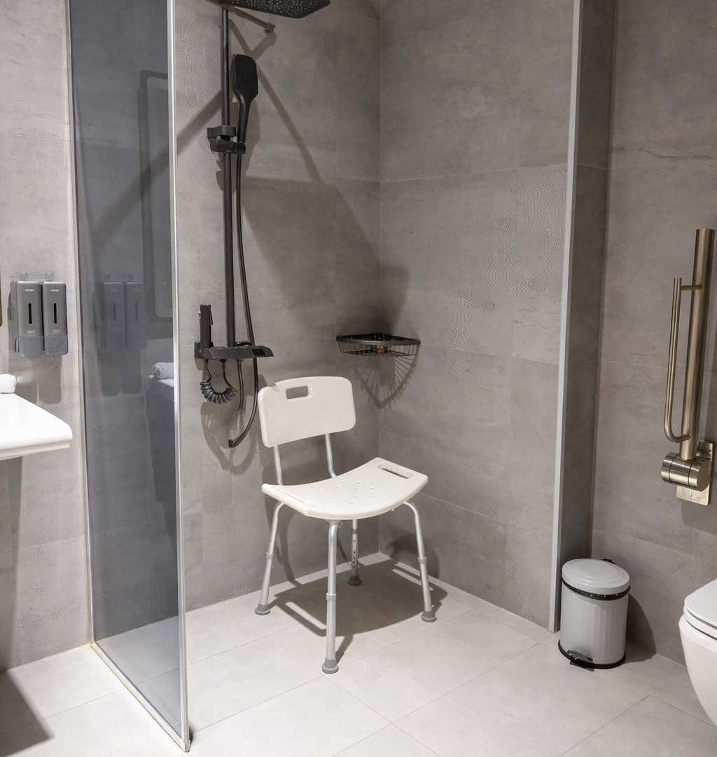 The Accessible Double Room is designed for comfort and easy mobility. It features a comfortable double bed, modern furnishings, and a spacious layout for smooth movement. The fully accessible bathroom includes a walk-in shower and support grab bars, ensuring safety and convenience throughout your stay.